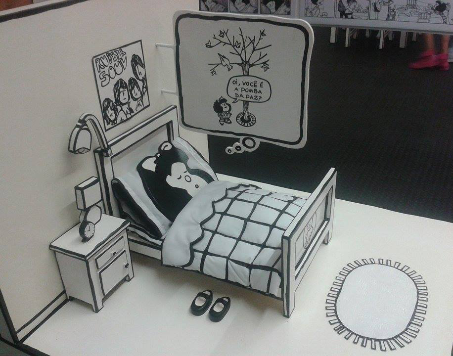 Também fiquei apaixonada por galerias em que era possível visualizar diversas réplicas dos “mundos” que aparecem nos quadrinhos da pequena crítica. Além disto, os visitantes da exposição também podiam assistir aos desenhos de Mafalda e brincar de produzir quadrinhos “humanos” – escolhendo alguns dos diálogos disponíveis para montar histórias com pessoas reais em mini cenários.